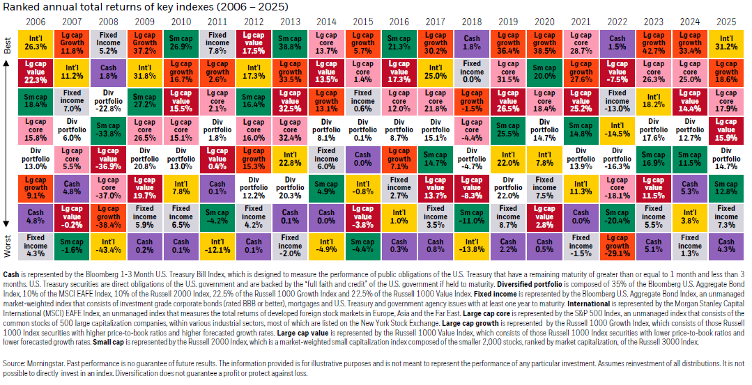 Investors generally shouldn’t take on more risk than is necessary to meet their financial goals. The Callan Periodic Table ranks calendar year returns for various asset classes. As the colors indicate, there’s a lot of variability year over year. But due to their relative stability and safety, the majority of US bond returns (teal) fall in the bottom half versus US stocks and other asset classes.
