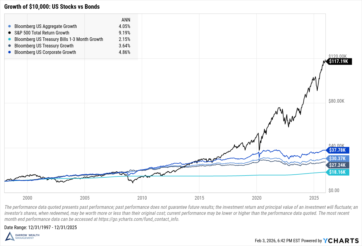 Long-term growth of $10,000: stocks versus bonds (1998 – 2024)